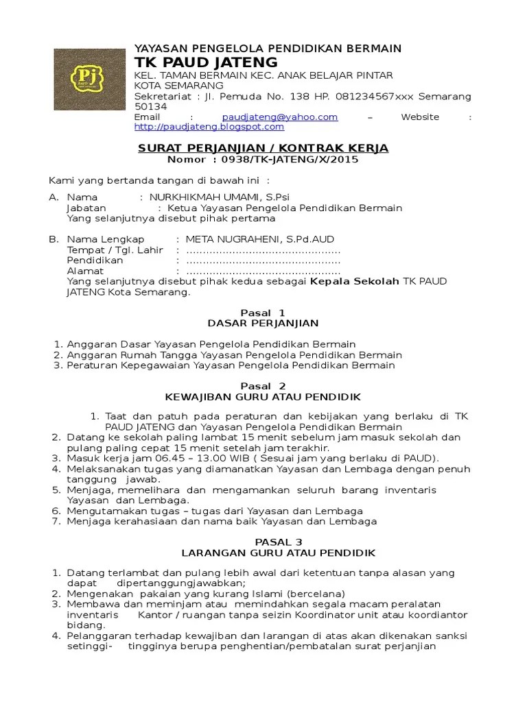 Kontrak tata usaha/operator · kontrak tenaga pendidik non pns (guru). Sk penugasan, surat perjanjian kontrak kerja, surat keterangan dari kepala dinas . Berikut kami sebarkan format surat kontrak kerja bagi tenaga honor dki jakarta yang. Itulah yang dapat kami bagikan terkait contoh surat perjanjian kontrak kerja guru honorer. Contoh surat lamaran guru honorer ke dinas pendidikan dapatkan contoh .